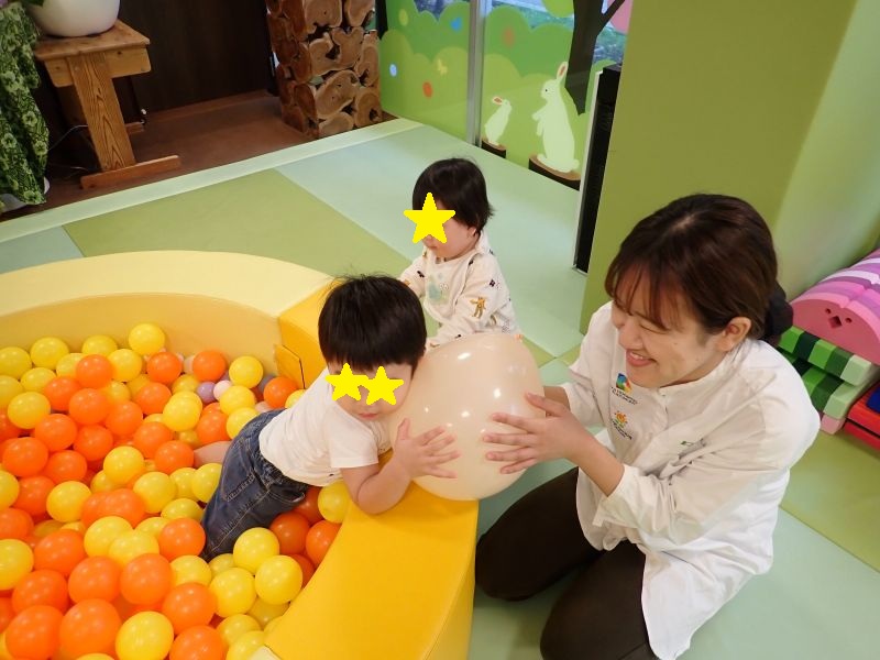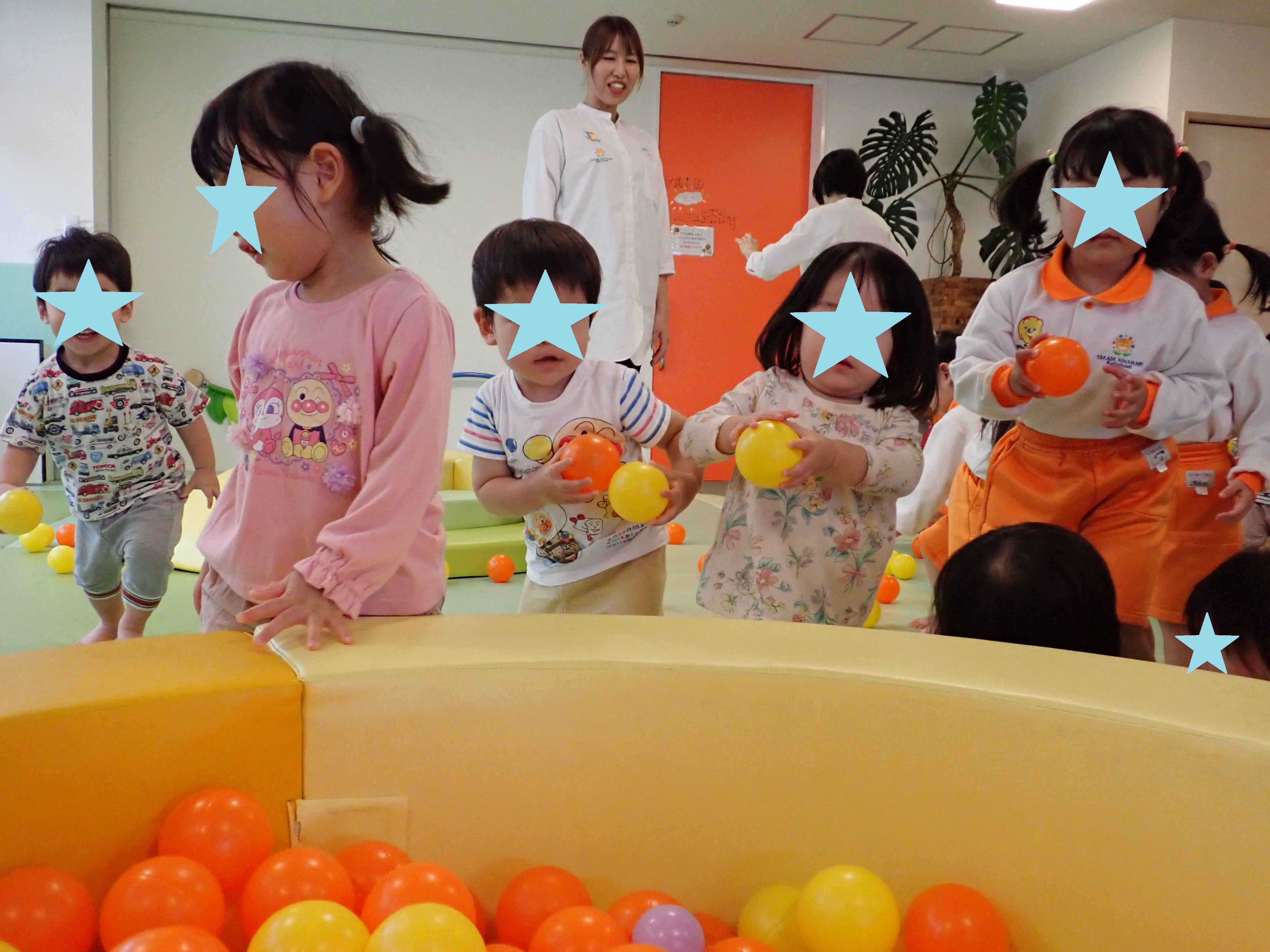 ボールプールに入って先生と遊ぶ姿も見られますね。今日も、みんな思い切り体を動かして遊びました。