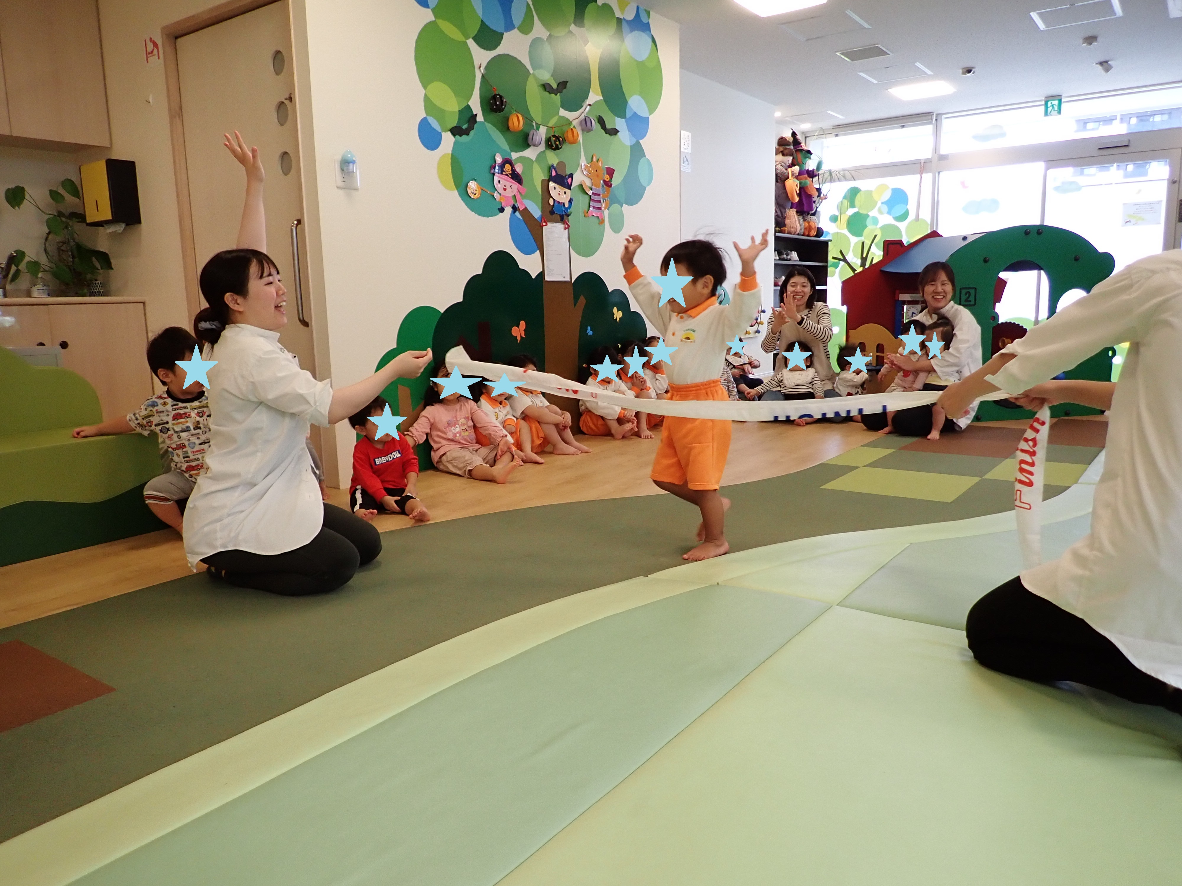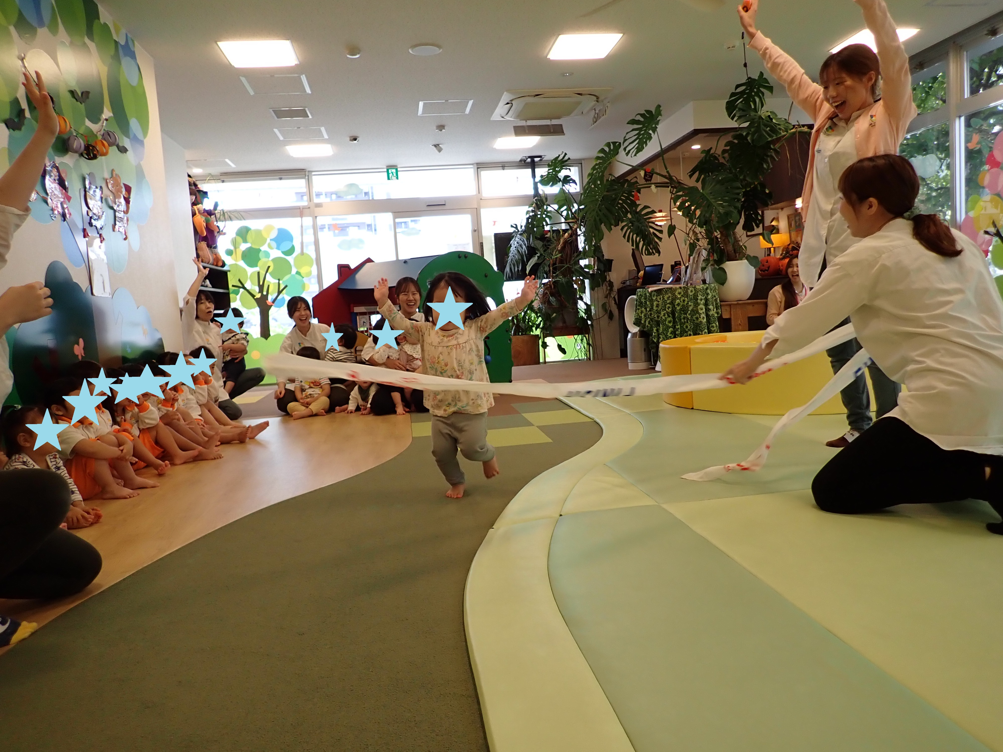 1・2歳児さんは本気のかけっこをして、ゴールテープを切った時はニコニコ笑顔がはじけていました☆