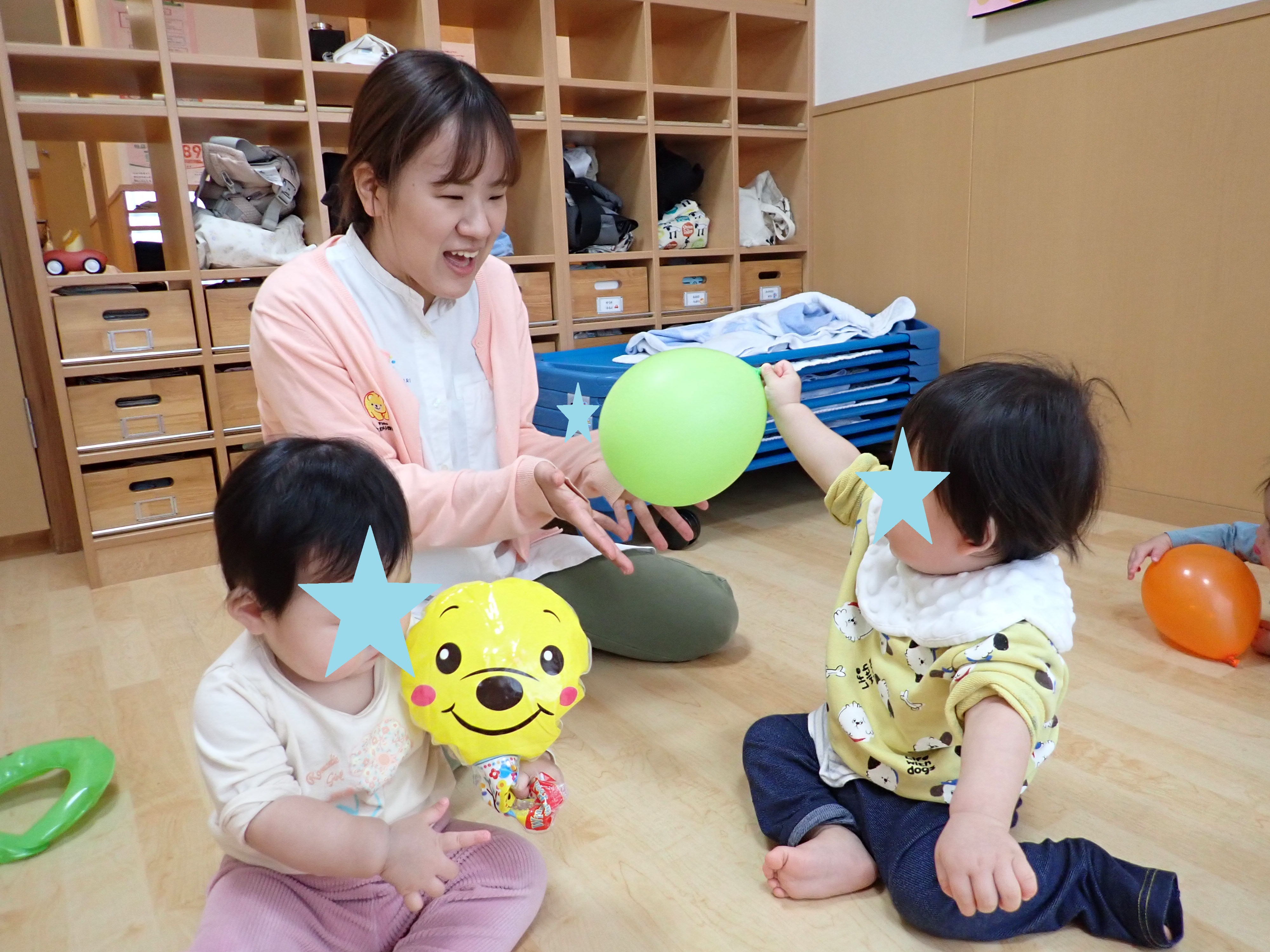今日は0歳児白組さんが風船遊びをしていましたよ☆