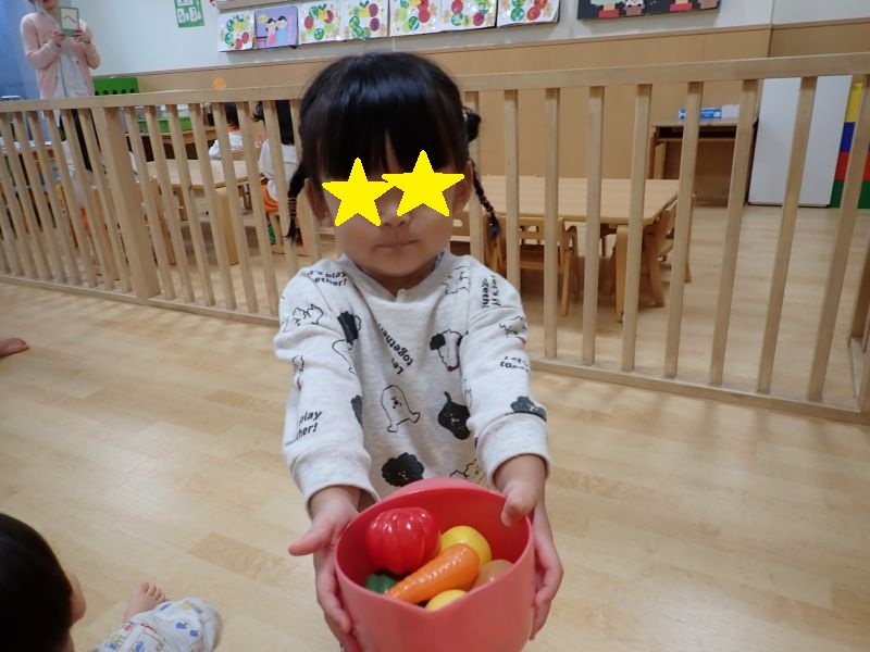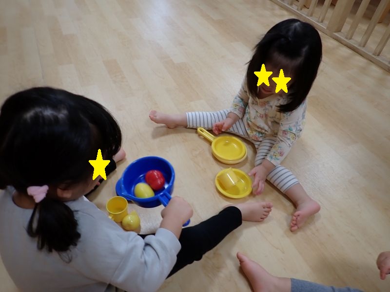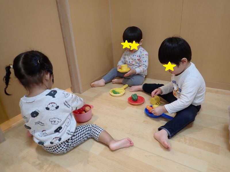こんにちは!大阪府守口市にある小規模保育園Fine保育園です。今日の1歳児クラスの子どもたちは、ままごと遊びを楽しみました☆