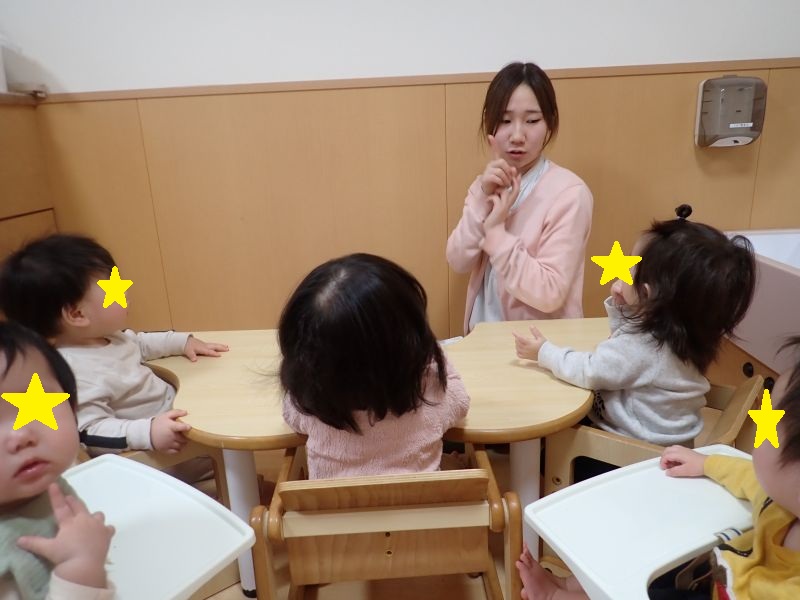 子どもたちは、絵本も大好きなのですが手遊びはもっと大好きで毎日、先生と一緒に楽しんでいます。絵本の前に手遊びをしています。